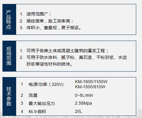 KM-1500是使用國外先進的螺旋泵送技術,并結合國內實際施工需求而開發(fā)出的一種新型灌漿與噴涂兩用機械。