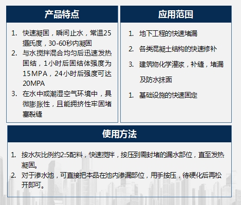 本產(chǎn)品是一種遇水即迅速發(fā)熱,并且具有微膨脹和抗裂性,是最為理想的快速堵漏止水材料。